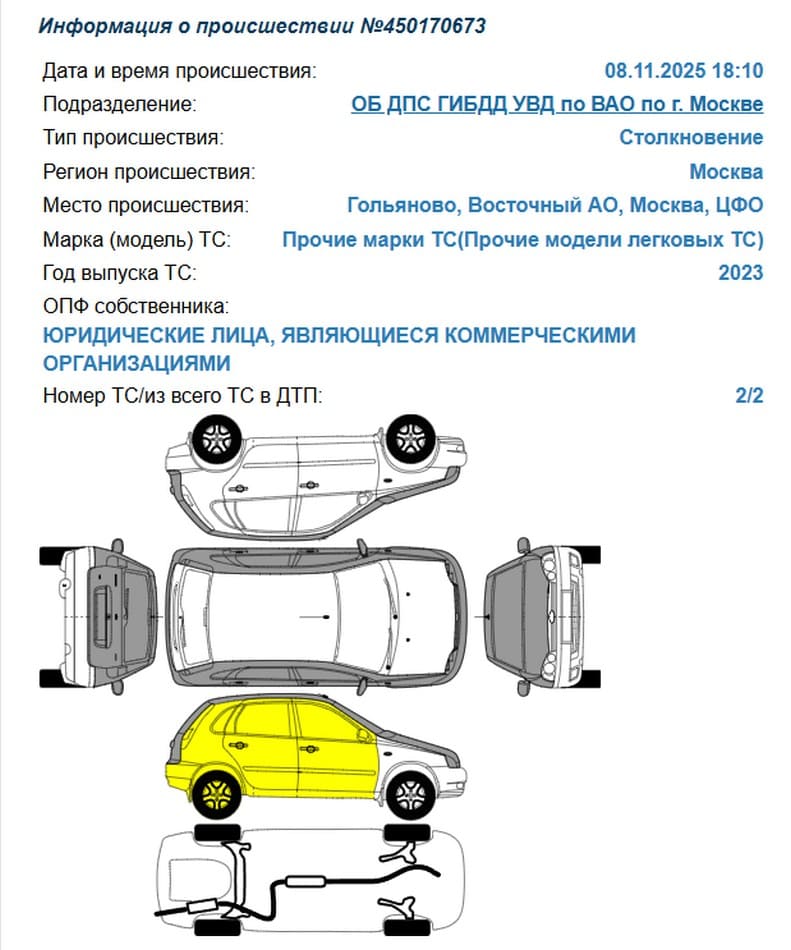 Также автомобиль 8 ноября 2025 года – в субботу – попал в ДТП в Москве в микрорайоне Гольяново. Он получил повреждения правой части, ремонт оценивается в сумму от 10 до 25 тысяч рублей. В тот день выписали еще и штраф за нарушения правил дорожной разметки. Произошло это чуть дальше на московском скоростном диаметре в районе улицы Маршала Федоренко, 15.
