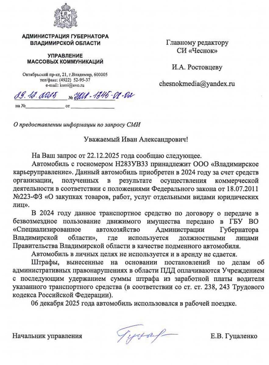 В Белом доме «Чесноку» подтвердили, что TANK 500 приобрели на средства, «полученные в результате осуществления коммерческой деятельности» ООО «Владимирское карьероуправление». В 2024 году внедорожник передали в безвозмездное пользование «Спецавтохозяйству администрации губернатора Владимирской области».