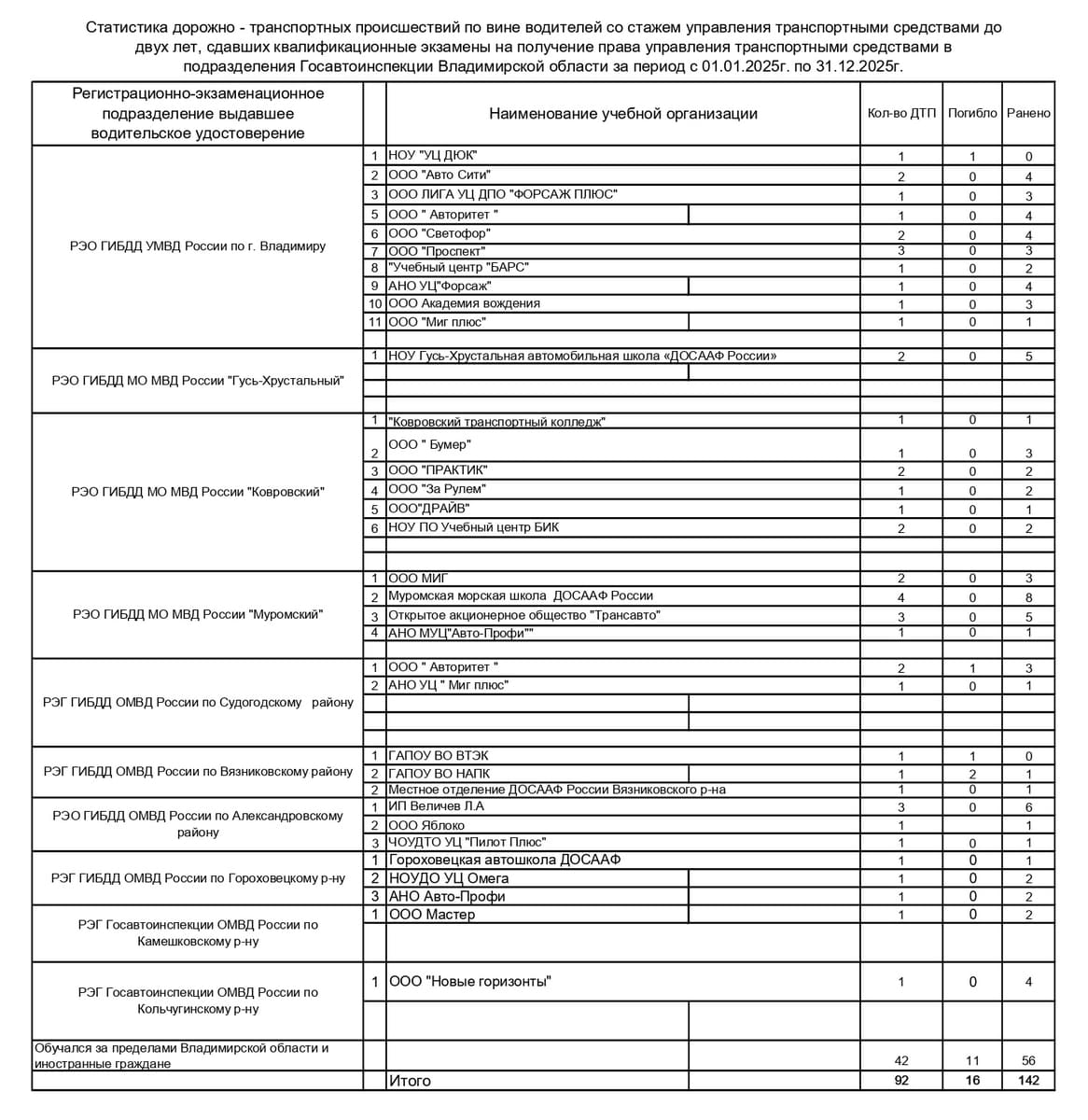 Наибольшее число ДТП в 2025 году пришлось на муромскую школу ДОСААФ: в 4-х авариях пострадали 8 человек. По 3 ДТП получили владимирская школа «Проспект» (3 пострадавших), муромское ОАО «Трансавто» (5 пострадавших) и ИП Величев из Александровского района (6 пострадавших).