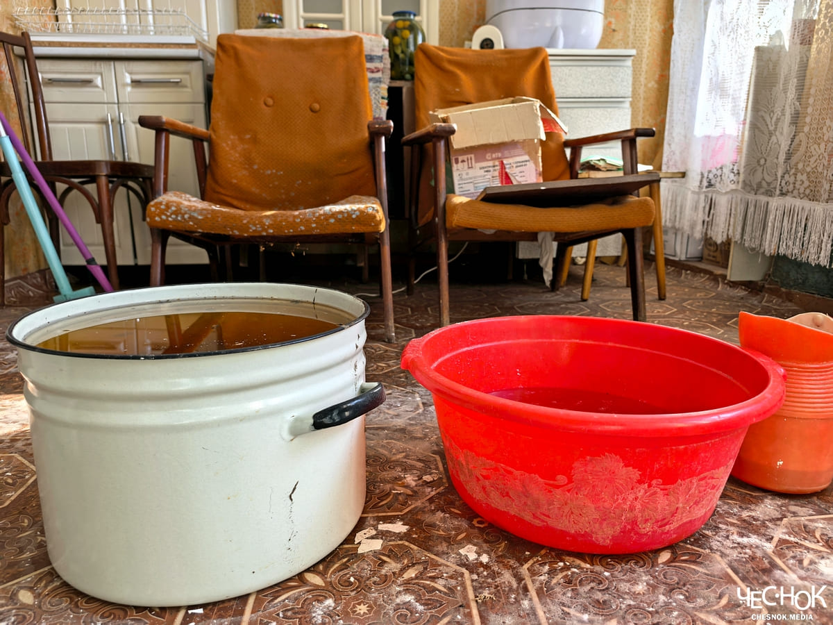 Ольге повезло: у нее было куда переехать. В ее квартире не то что жить, даже находиться сложно. Запах мокрого подвала встречает уже в подъезде. В квартирах, даже на первом этаже, по всей площади расставлены тазы, ведра и кастрюли. Из-за этого приходится обесточивать розетки, потому что проводка тоже мокрая. Батареи в комнатах тоже ледяные. Из ванны течет канализация.