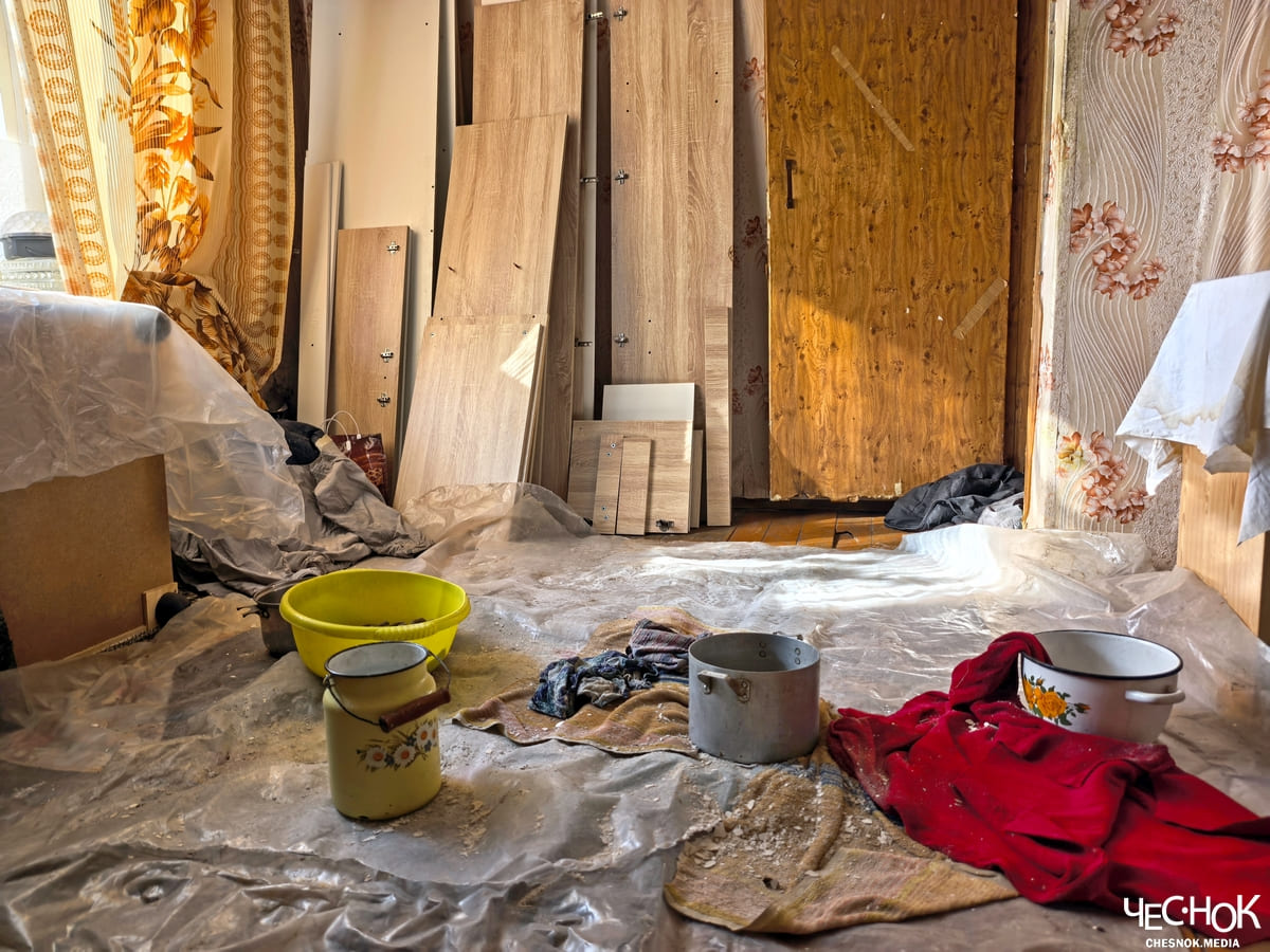 Да и собственная двухкомнатная квартира Надежды разрушается буквально на глазах. Центр квартиры – печка, которую много лет назад построил муж Надежды. Ощущение, что жилище держится исключительно на ней: внешние стены мокрые насквозь, доски в полах размокли, рассохлись и расползаются от каждого шага. От старого, пусть и скромного ремонта уже ничего не осталось. Обои и потолочная плитка свисают кусками, а где-то уже полностью отвалились.
